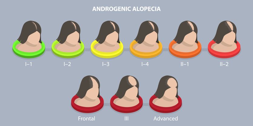 這並非男士專利。女性的雄性禿通常表現為頭頂和分界線的頭髮逐漸稀疏,髮量減少,但髮際 線通常不會像男性一樣後移形成M字額。主要與遺傳基因有關,但更常在更年期前後發生,因為女性體內雌激素減少,雄性激素(如DHT)的相對比例增加,DHT會攻擊毛 囊,縮短頭髮 生長期。