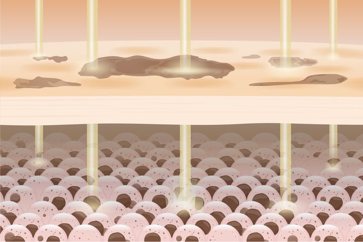 當高能量的皮秒雷射透過蜂巢透鏡進入真皮層,會產生稱為 LIOB 的空泡效應。這過程會在皮膚內部炸開極其微細的空穴,這些空泡雖然肉眼看不見,卻能產生壓力波,迫使陳舊組織退場,為新生細胞騰出空間,從根本改善皮膚問題。